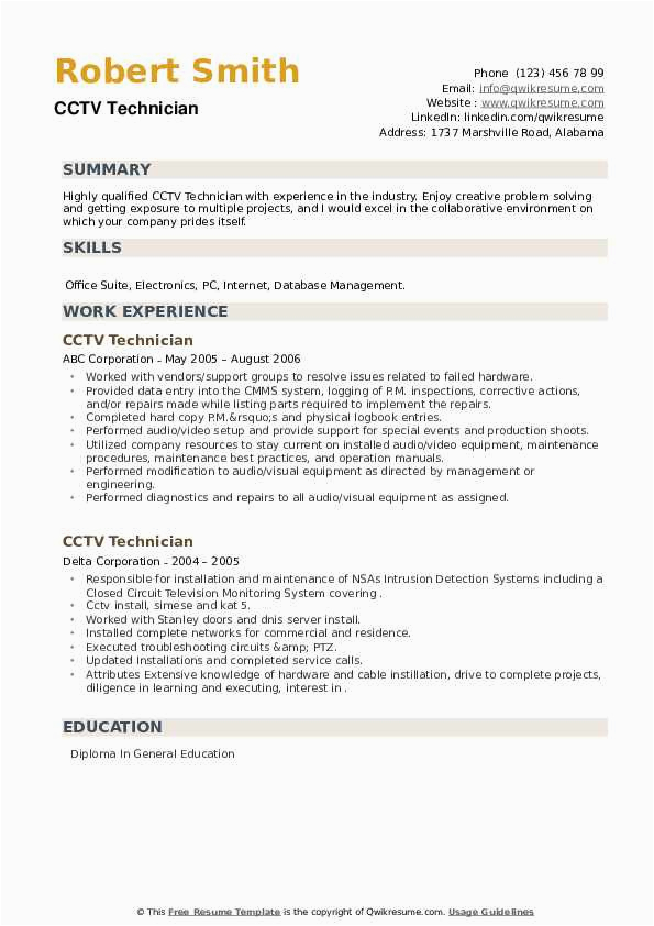 Next you are searching for the perfect job, you will of course want to put your best foot focus on in the same way as an fabulous and well-formatted resume. One quirk of assuring that you have such a resume is to download a best sample resume of cctv technician. These templates can come up with the money for you bearing in mind the perfect resume you are looking for or suitably use them as a lead to create your own.