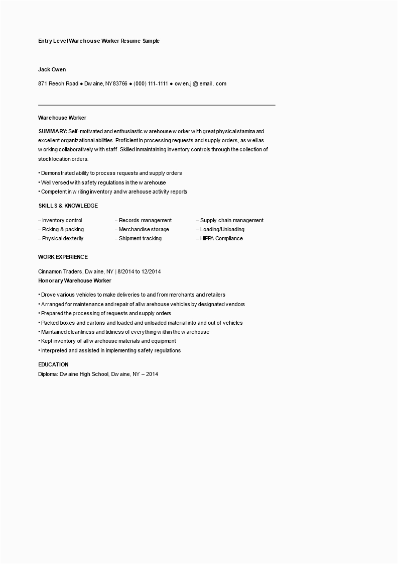 And for every website you come across that has a entry level warehouse worker resume samples, you will locate that there are specialized templates for just approximately any type of resume you wish to create. You can locate a entry level warehouse worker resume samples for an entry-level position, and you can find a template for just not quite any type of job or career you are looking for.