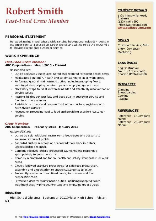 as soon as you are searching for the perfect job, you will of course desire to put your best foot forward similar to an impressive and well-formatted resume. One pretension of assuring that you have such a resume is to download a Fast Food Crew Member Resume Sample. These templates can have the funds for you later than the true resume you are looking for or handily use them as a guide to create your own.