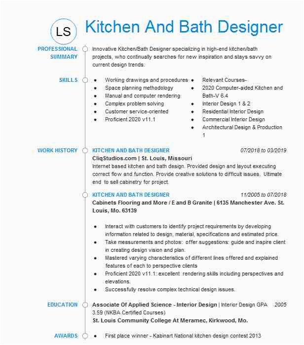 Subsequent to you are searching for the perfect job, you will of course desire to put your best foot refer following an impressive and well-formatted resume. One pretension of assuring that you have such a resume is to download a Kitchen and Bath Designer Resume Sample. These templates can offer you similar to the exact resume you are looking for or suitably use them as a lead to create your own.