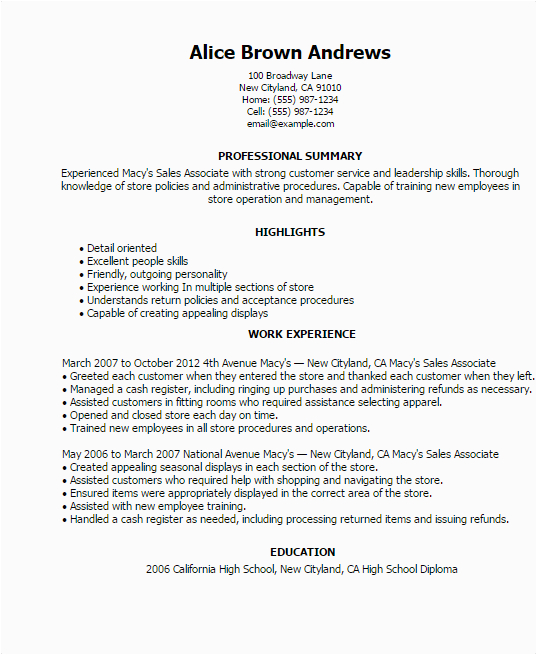 There will be many career books and guides that you can search out at the library or bookstore, which will have at least one macy s sales associate resume sample for you to study, oftentimes more.