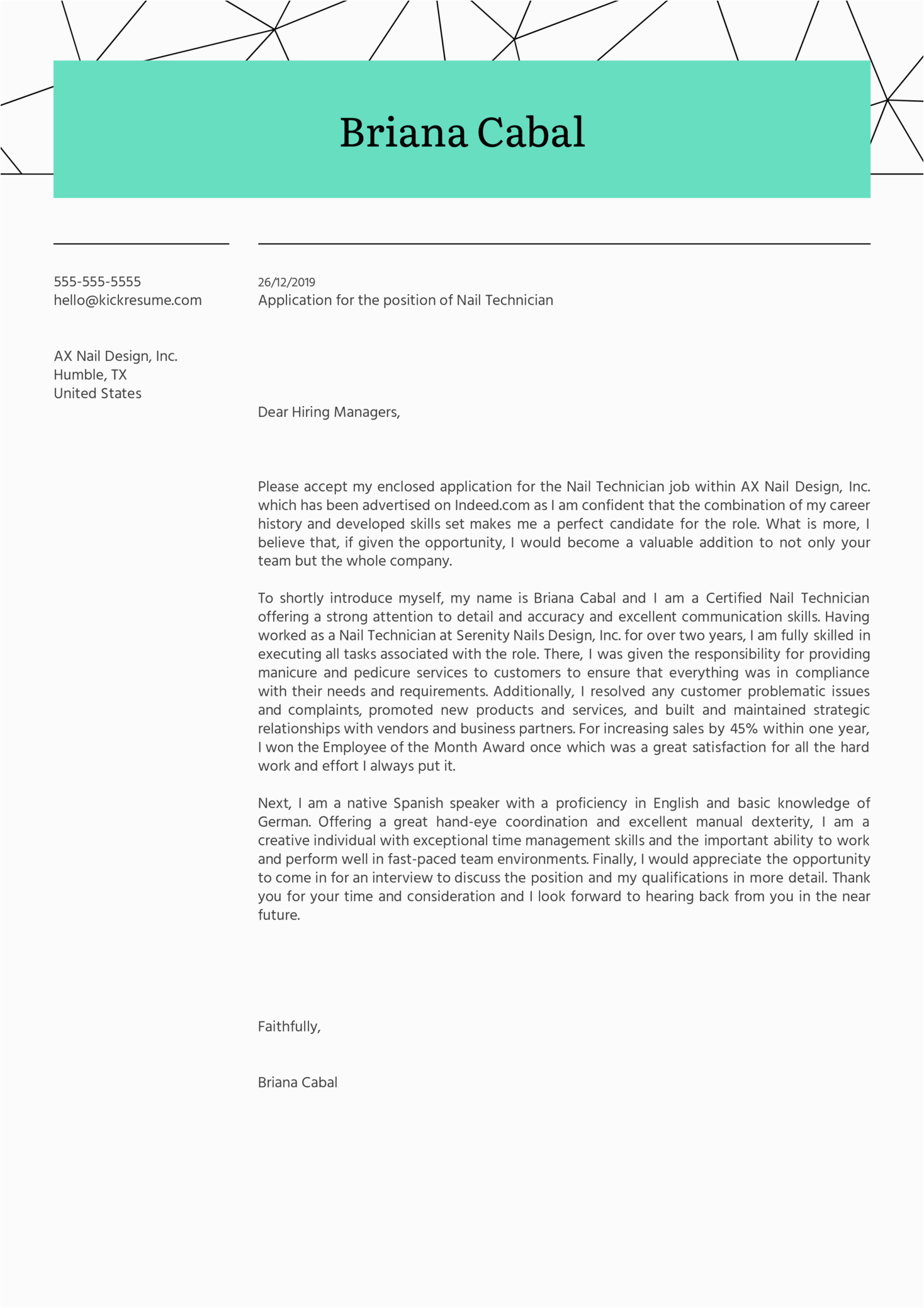 And for every website you come across that has a nail technician resume cover letter sample, you will locate that there are specialized templates for just nearly any type of resume you wish to create. You can locate a nail technician resume cover letter sample for an entry-level position, and you can find a template for just more or less any type of job or career you are looking for.