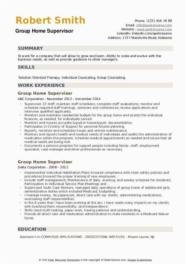 Similar to you are searching for the perfect job, you will of course want to put your best foot tackle later than an fabulous and well-formatted resume. One artifice of assuring that you have such a resume is to download a residential group home manager sample resume. These templates can offer you like the precise resume you are looking for or understandably use them as a lead to create your own.