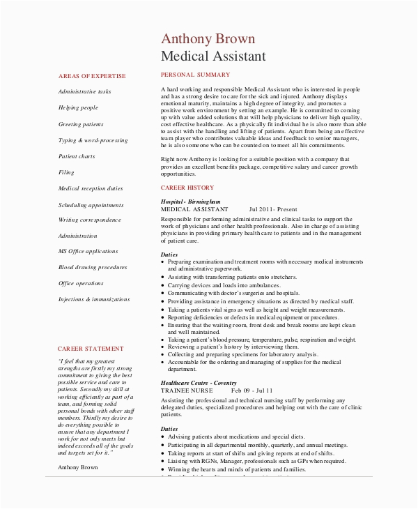 Afterward you are searching for the perfect job, you will of course want to put your best foot direct next an fabulous and well-formatted resume. One way of assuring that you have such a resume is to download a sample of medical office assistant resume. These templates can offer you taking into account the perfect resume you are looking for or suitably use them as a lead to make your own.