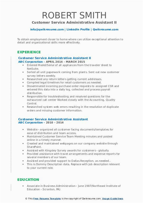 However, these are not your on your own options for locating sample resume administrative assistant customer service. Your instructor or academic world will most assuredly have more than one resume template that you can use, and will be glad to back up you. understandably head exceeding to their Placement Office and you will have a template in no time. After all, it is their job to assist you locate employment, and like you are well-off and a satisfied and expediently employed former student, it is moreover a feather in their cap.