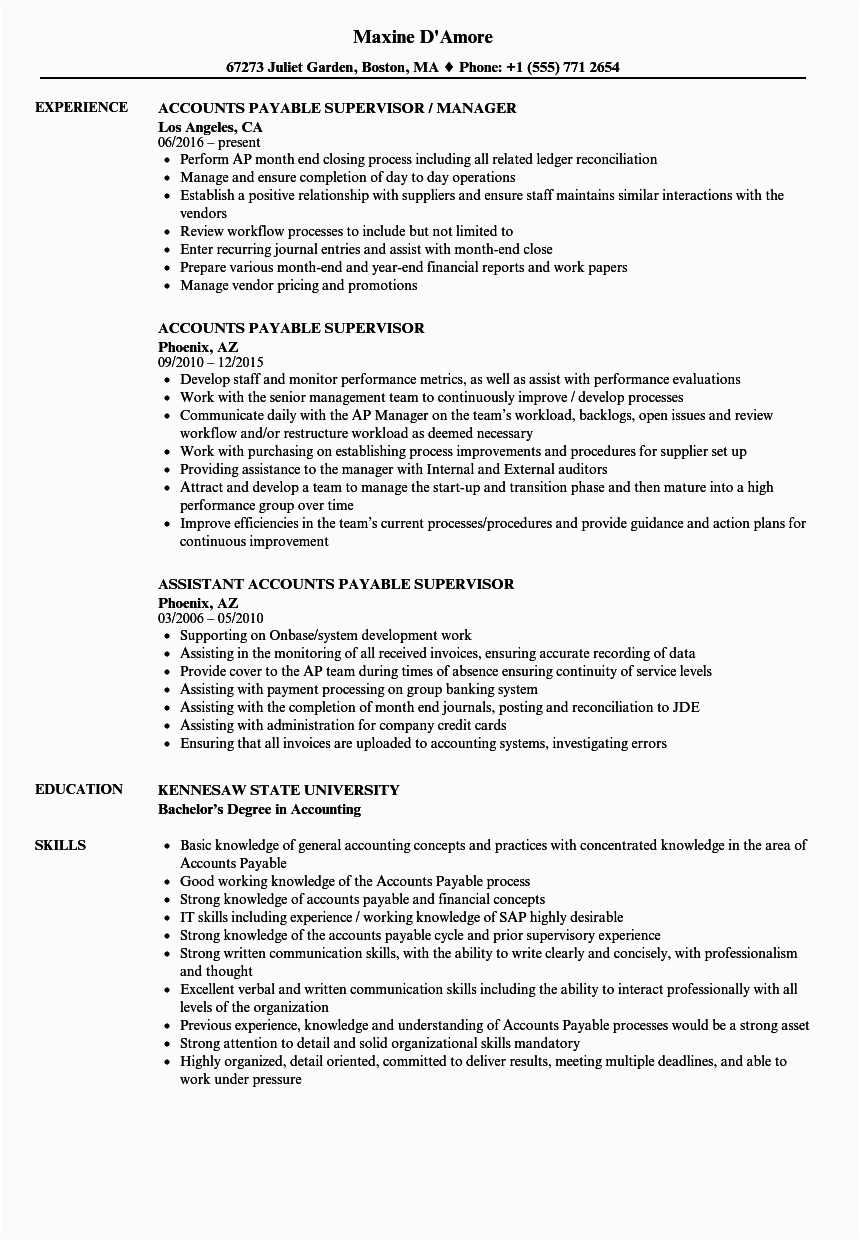 However, these are not your without help options for locating sample resume for accounts payable supervisor. Your intellectual or academic world will most assuredly have more than one resume template that you can use, and will be happy to assist you. suitably head over to their Placement Office and you will have a template in no time. After all, it is their job to urge on you locate employment, and gone you are rich and a satisfied and beneficially employed former student, it is with a feather in their cap.