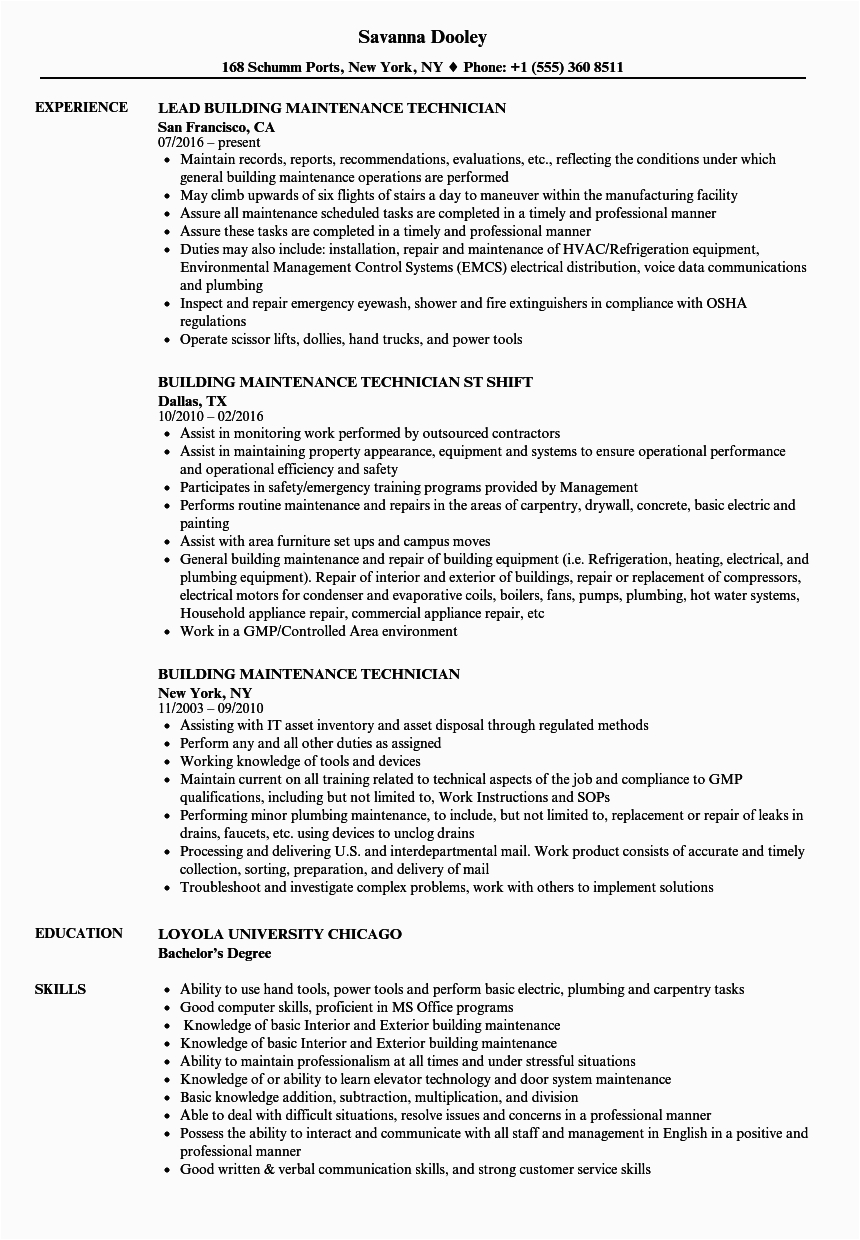 There are as a result many options for you as you search for the perfect sample resume for building maintenance technician, and subsequent to some difficult take action and perseverance upon your part, you will locate yourself next a first-class resume in no time, and hopefully, a first-class employer, as well!. For more guidance on resumes or for a sample resume for building maintenance technician checkout this recommended websites.