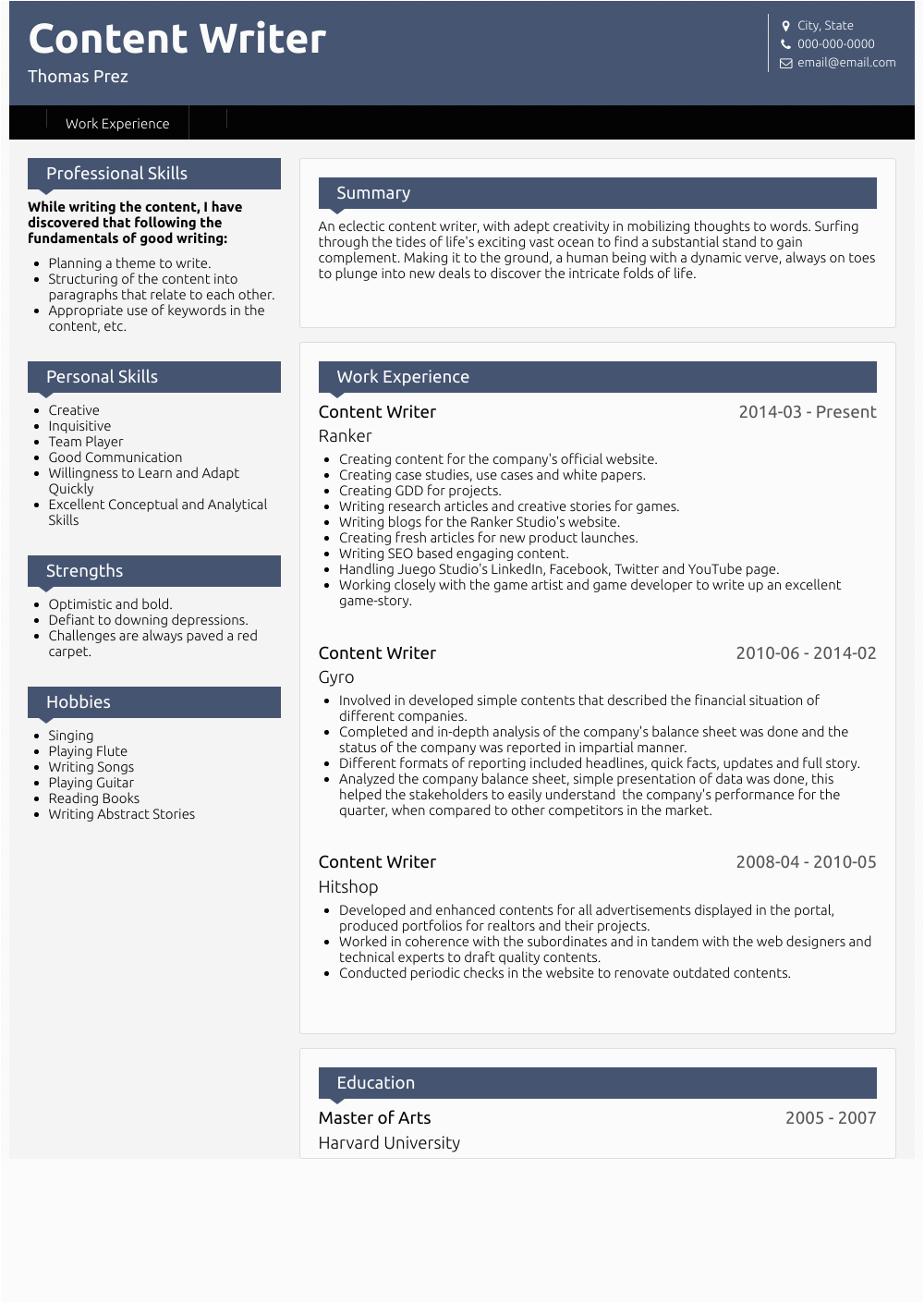 There will be many career books and guides that you can search out at the library or bookstore, which will have at least one sample resume for content writer fresher for you to study, oftentimes more.