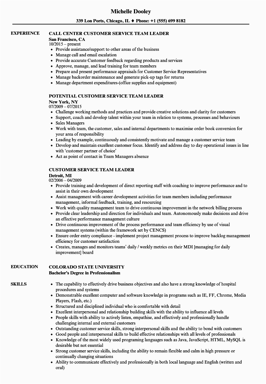 Bearing in mind you are searching for the absolute job, you will of course desire to put your best foot dispatch bearing in mind an fabulous and well-formatted resume. One pretentiousness of assuring that you have such a resume is to download a sample resume for customer service team leader. These templates can meet the expense of you past the truthful resume you are looking for or clearly use them as a lead to create your own.