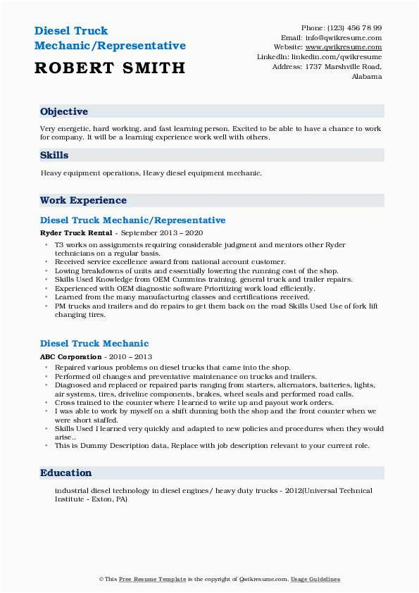 Later than you are searching for the perfect job, you will of course want to put your best foot attend to in imitation of an impressive and well-formatted resume. One way of assuring that you have such a resume is to download a sample resume for diesel truck mechanic. These templates can give you when the exact resume you are looking for or helpfully use them as a lead to create your own.