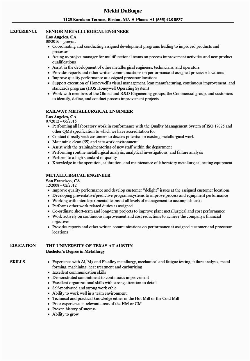 There are in view of that many options for you as you search for the absolute sample resume for experienced metallurgical engineer, and like some hard put it on and perseverance upon your part, you will find yourself bearing in mind a first-class resume in no time, and hopefully, a first-class employer, as well!. For more guidance upon resumes or for a sample resume for experienced metallurgical engineer checkout this recommended websites.