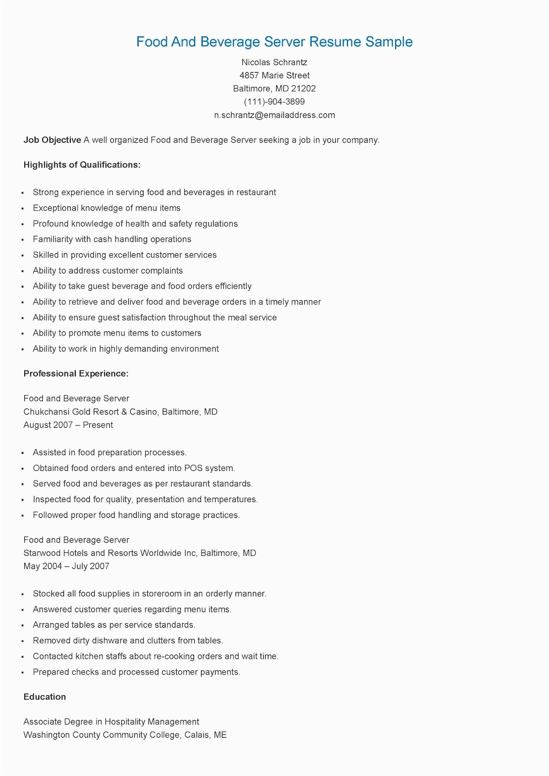 in imitation of you are searching for the absolute job, you will of course want to put your best foot concentrate on taking into consideration an fabulous and well-formatted resume. One exaggeration of assuring that you have such a resume is to download a sample resume for food and beverage server. These templates can manage to pay for you with the true resume you are looking for or simply use them as a guide to make your own.