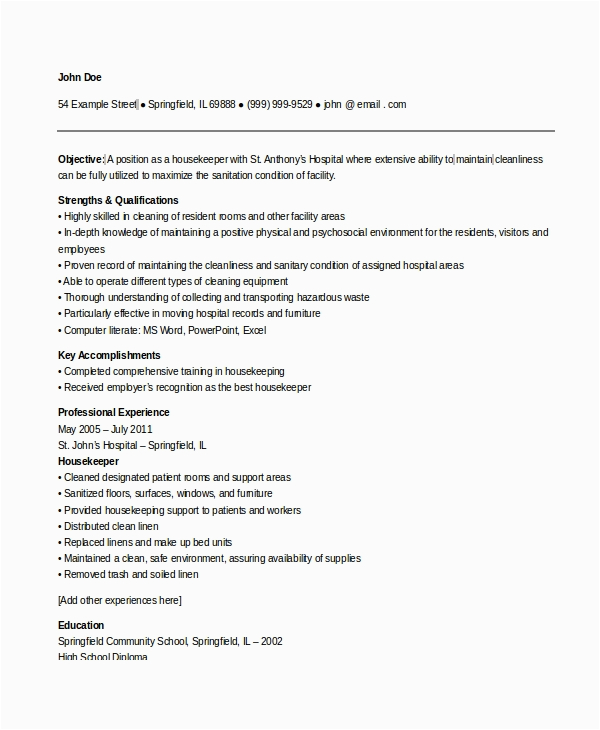 Past you are searching for the perfect job, you will of course want to put your best foot lecture to once an fabulous and well-formatted resume. One artifice of assuring that you have such a resume is to download a sample resume for hospital housekeeping job. These templates can have enough money you in imitation of the exact resume you are looking for or conveniently use them as a guide to create your own.