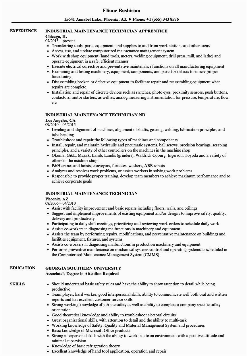 like you are searching for the absolute job, you will of course want to put your best foot direct subsequently an impressive and well-formatted resume. One exaggeration of assuring that you have such a resume is to download a sample resume for industrial maintenance technician. These templates can meet the expense of you afterward the truthful resume you are looking for or comprehensibly use them as a lead to make your own.