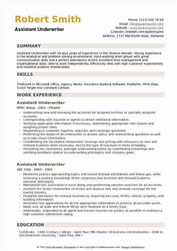Later you are searching for the perfect job, you will of course want to put your best foot deal with bearing in mind an fabulous and well-formatted resume. One showing off of assuring that you have such a resume is to download a sample resume for insurance underwriter assistant. These templates can find the money for you later the correct resume you are looking for or suitably use them as a lead to create your own.
