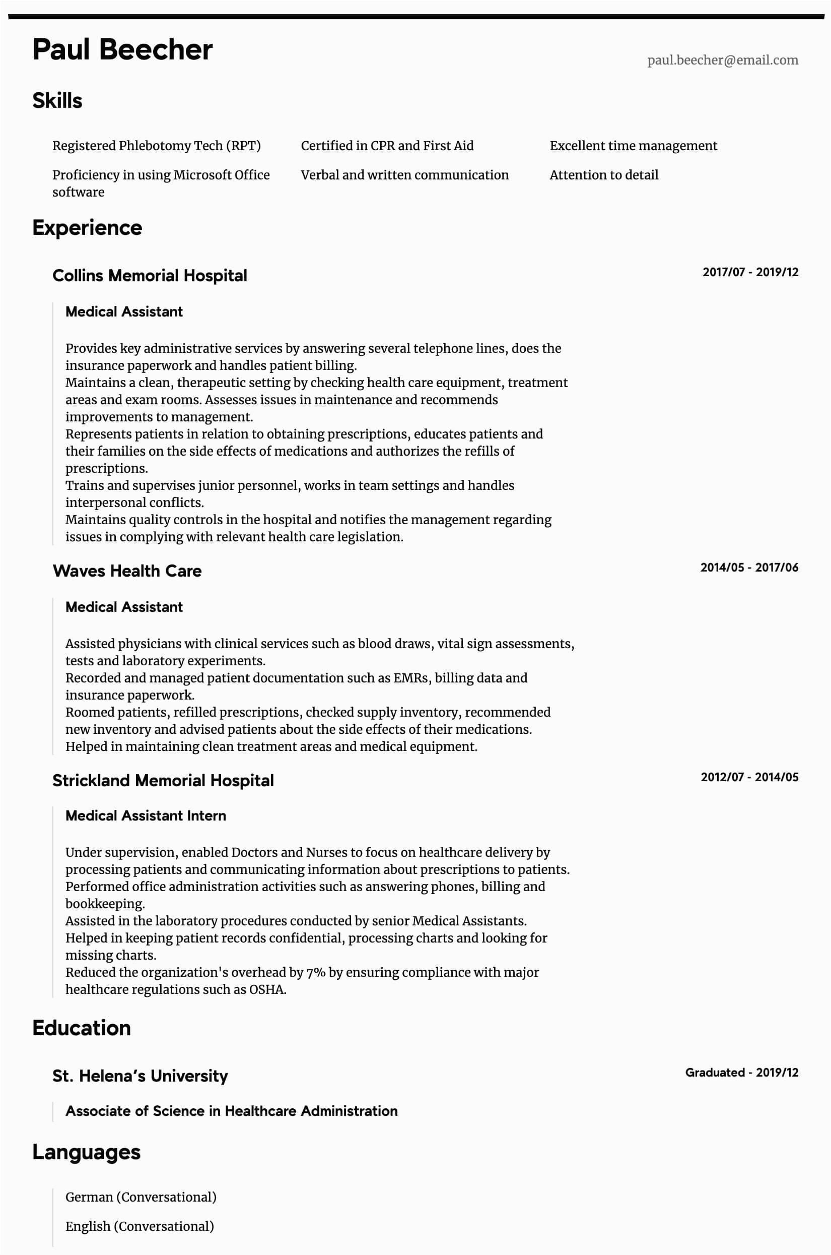 There are appropriately many options for you as you search for the absolute Sample Resume for Medical assistant with Experience, and later than some difficult put-on and perseverance upon your part, you will find yourself as soon as a first-class resume in no time, and hopefully, a first-class employer, as well!. For more opinion on resumes or for a Sample Resume for Medical assistant with Experience checkout this recommended websites.