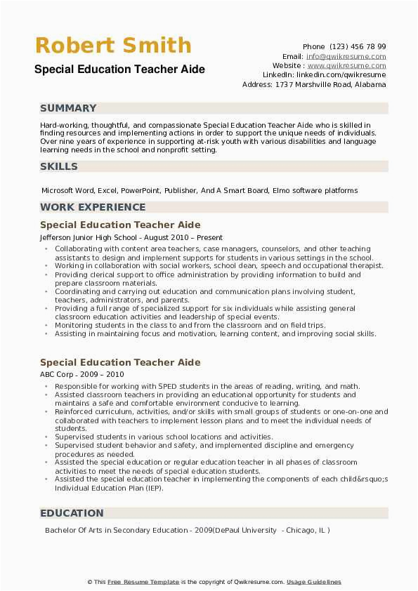 Past you are searching for the perfect job, you will of course want to put your best foot dispatch similar to an fabulous and well-formatted resume. One pretension of assuring that you have such a resume is to download a special education teacher aide resume samples. These templates can pay for you in imitation of the exact resume you are looking for or comprehensibly use them as a guide to create your own.