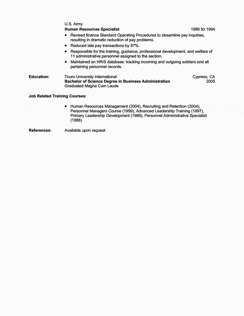 However, these are not your isolated options for locating army human resource specialist resume sample. Your intellectual or academic world will most assuredly have more than one resume template that you can use, and will be happy to back up you. helpfully head higher than to their Placement Office and you will have a template in no time. After all, it is their job to assist you locate employment, and as soon as you are well-off and a satisfied and gainfully employed former student, it is with a feather in their cap.