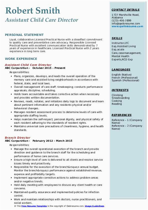 Taking into account you are searching for the absolute job, you will of course want to put your best foot tackle later an fabulous and well-formatted resume. One way of assuring that you have such a resume is to download a Assistant Director Child Care Resume Sample. These templates can meet the expense of you later the perfect resume you are looking for or comprehensibly use them as a guide to make your own.