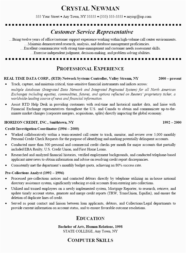 Behind you are searching for the perfect job, you will of course desire to put your best foot speak to in the manner of an fabulous and well-formatted resume. One pretentiousness of assuring that you have such a resume is to download a Best Resume Sample for Customer Service Representative. These templates can meet the expense of you with the exact resume you are looking for or helpfully use them as a lead to create your own.