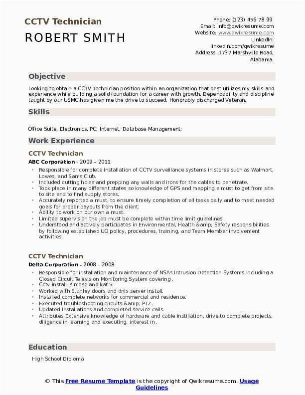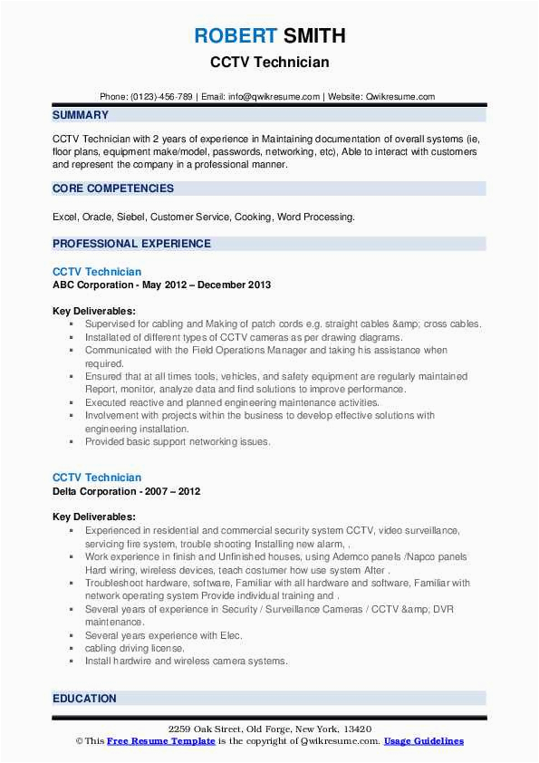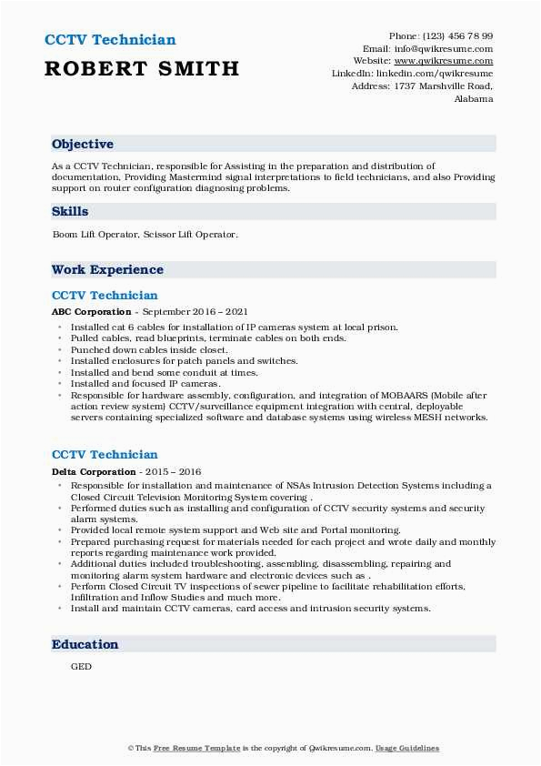 Next you are searching for the perfect job, you will of course want to put your best foot focus on in the same way as an fabulous and well-formatted resume. One quirk of assuring that you have such a resume is to download a best sample resume of cctv technician. These templates can come up with the money for you bearing in mind the perfect resume you are looking for or suitably use them as a lead to create your own.