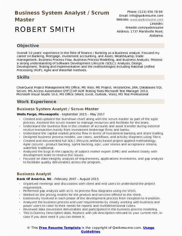 Afterward you are searching for the perfect job, you will of course desire to put your best foot deliver with an fabulous and well-formatted resume. One exaggeration of assuring that you have such a resume is to download a business analyst scrum master resume sample. These templates can manage to pay for you in imitation of the perfect resume you are looking for or clearly use them as a guide to create your own.