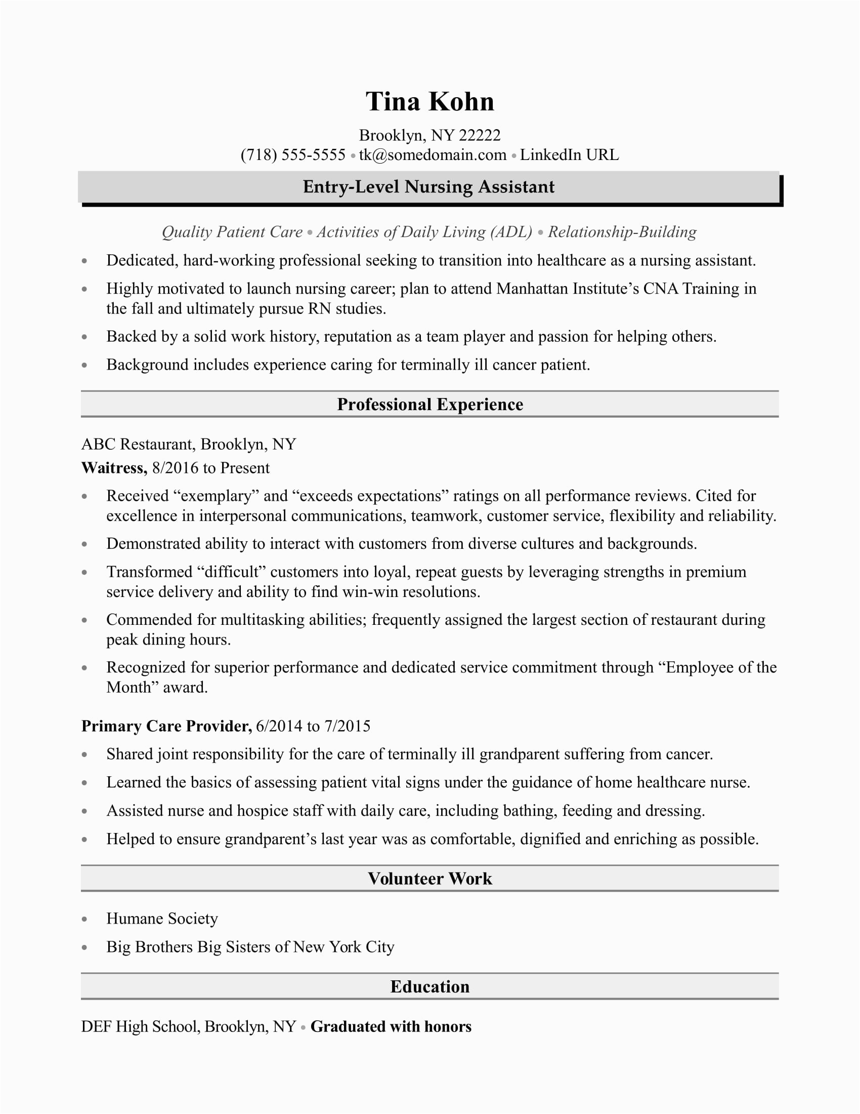 There will be many career books and guides that you can search out at the library or bookstore, which will have at least one certified nursing assistant resume sample no experience for you to study, oftentimes more.