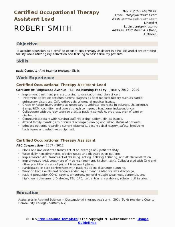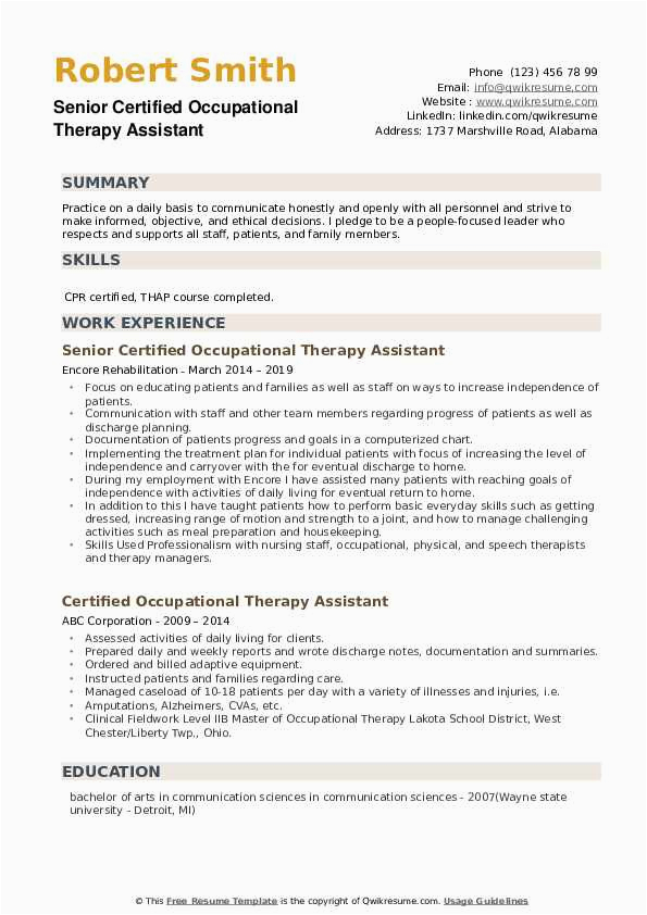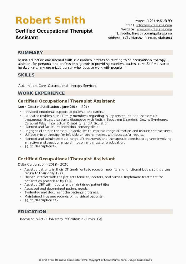 Certified Occupational therapy assistant Resume Samples Certified Occupational therapy assistant Resume Samples and all other pictures, designs or photos on our website are copyright of their respective owners. we get our pictures from another websites, search engines and other sources to use as an inspiration for you. please contact us if you think we are infringing copyright of your pictures using contact page. we will be very happy to help you.
