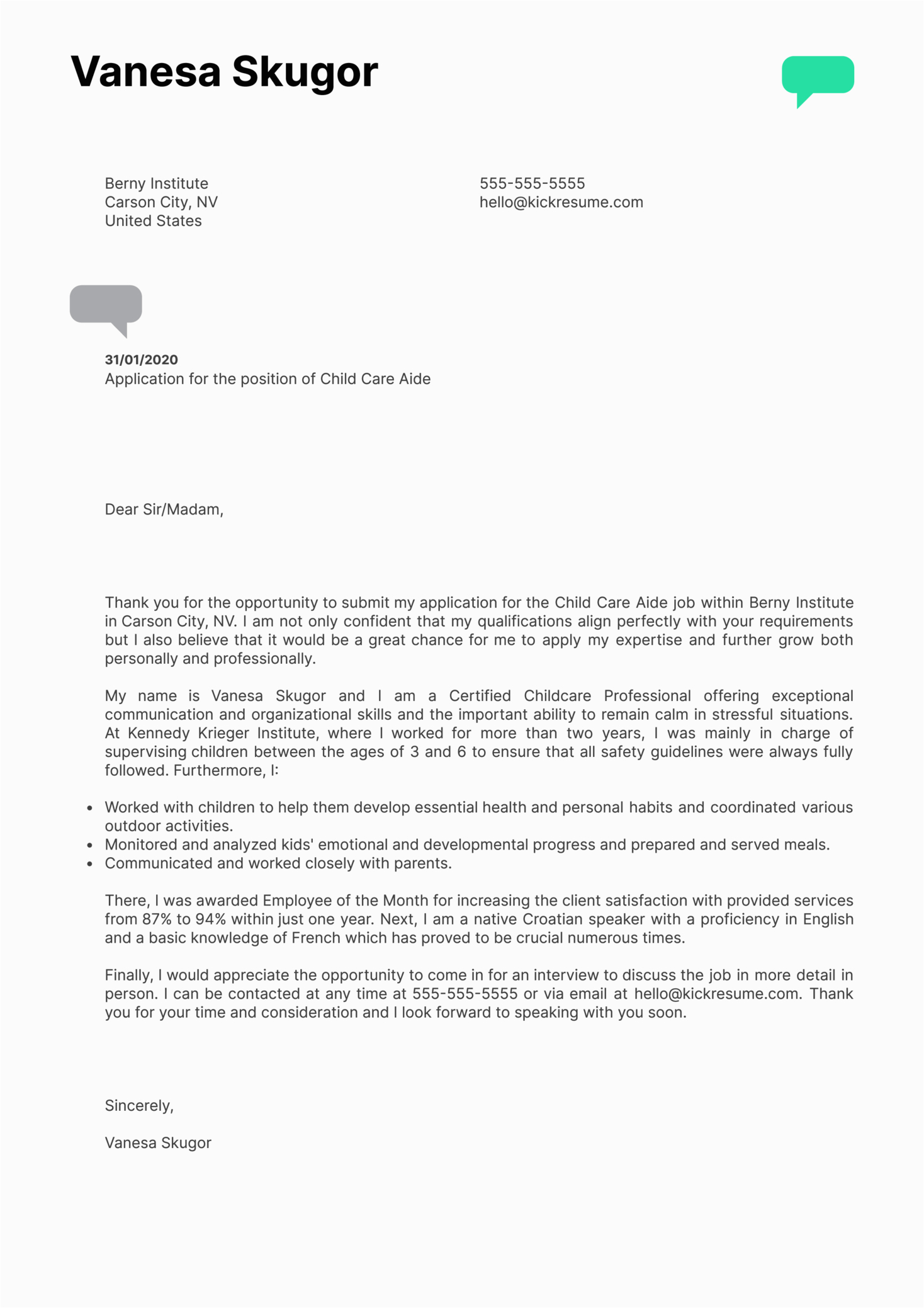 Child Care Aide Cover Letter Example
