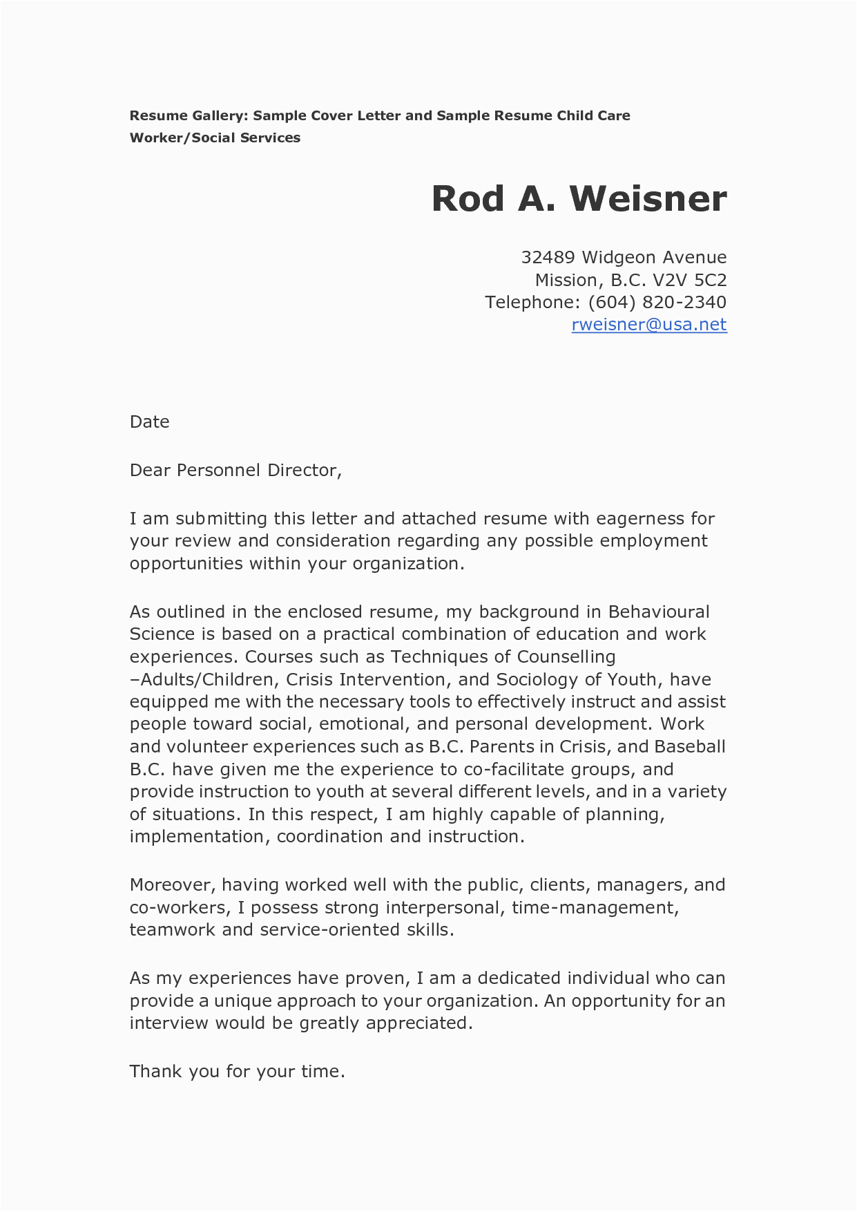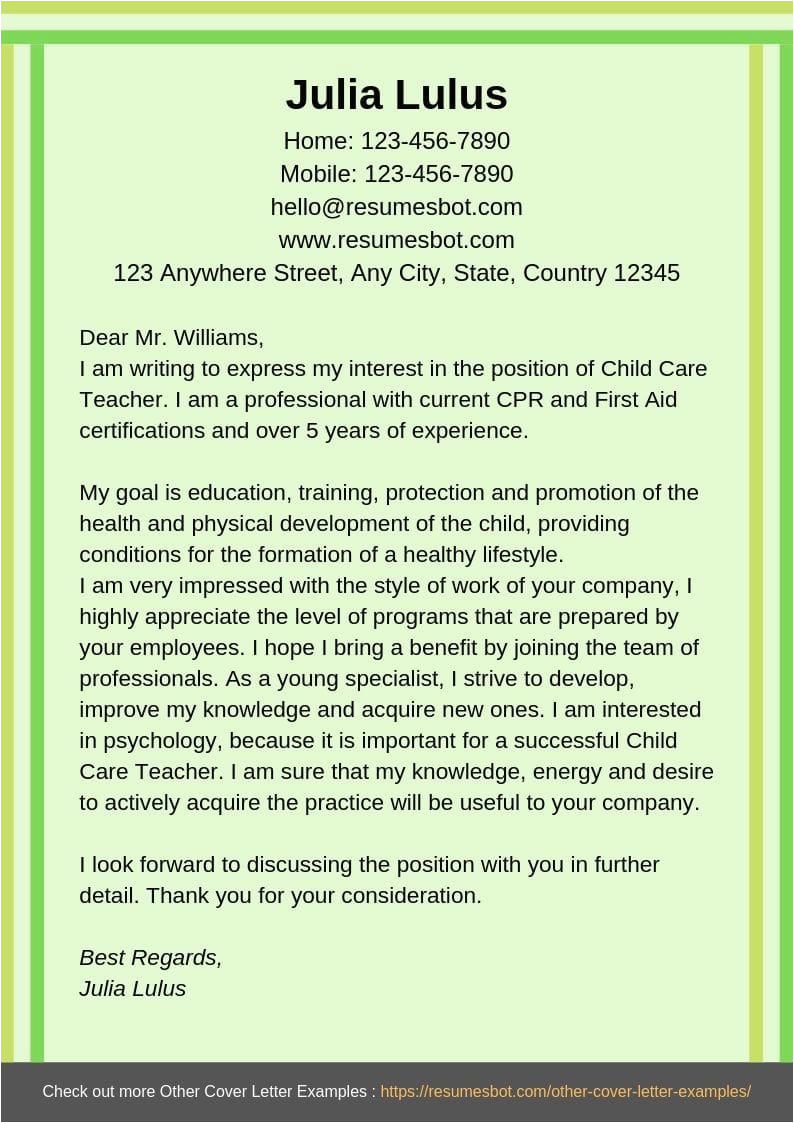 Child Care Cover Letter For Resume