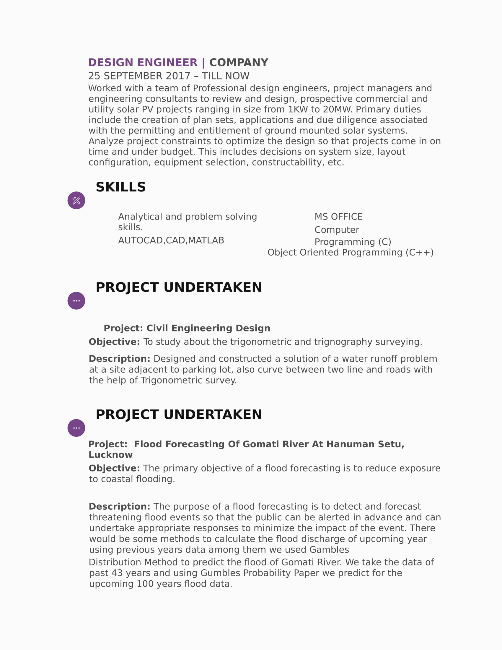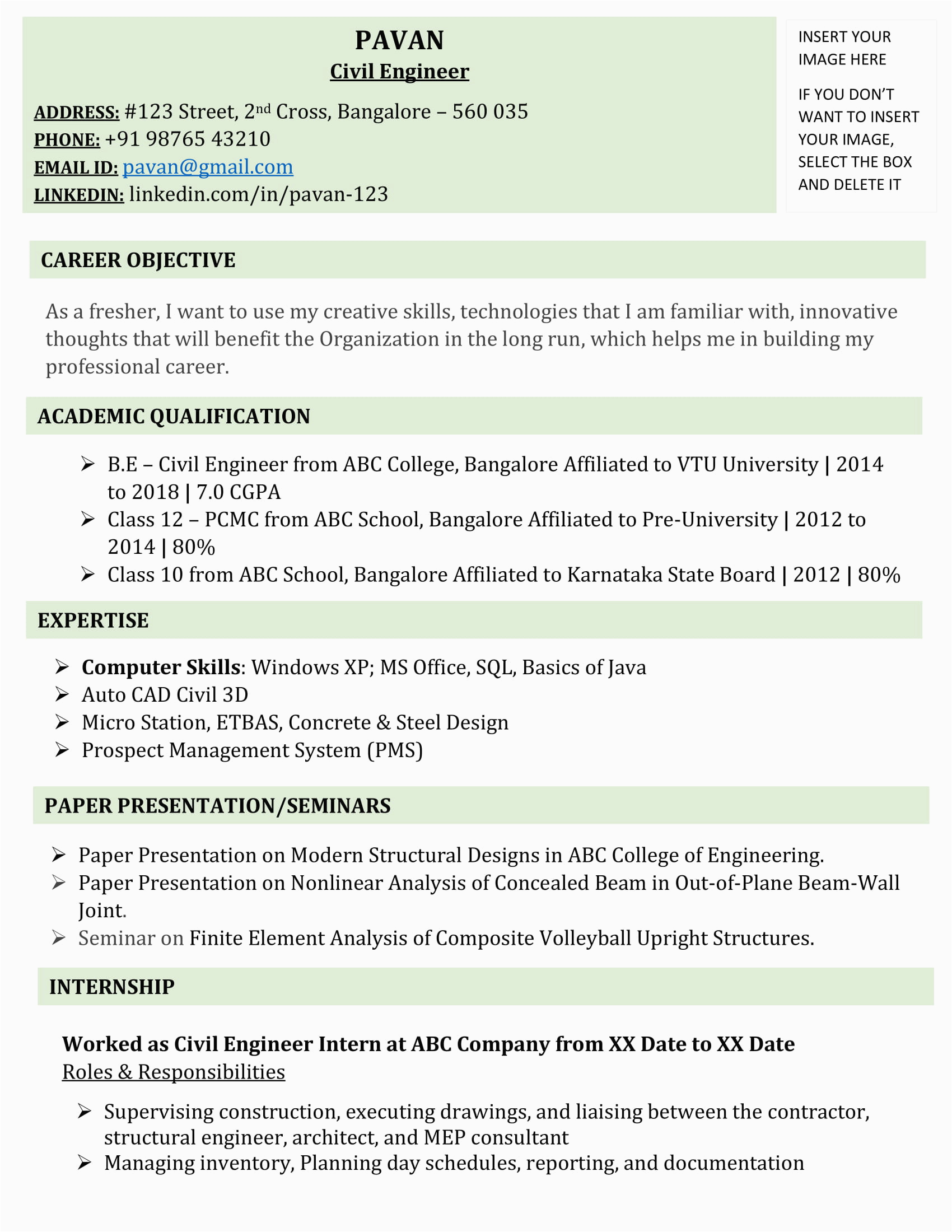 in the manner of you are searching for the absolute job, you will of course desire to put your best foot attend to as soon as an impressive and well-formatted resume. One pretension of assuring that you have such a resume is to download a civil engineering sample resume for freshers. These templates can have the funds for you in imitation of the precise resume you are looking for or comprehensibly use them as a guide to make your own.