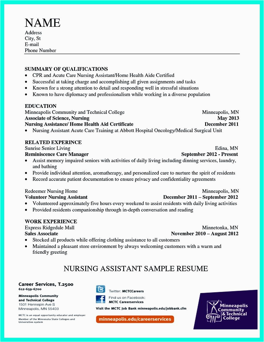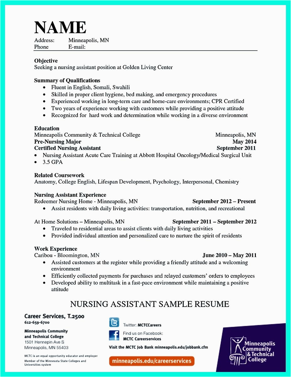 There will be many career books and guides that you can search out at the library or bookstore, which will have at least one cna certified nursing assistant resume sample for you to study, oftentimes more.