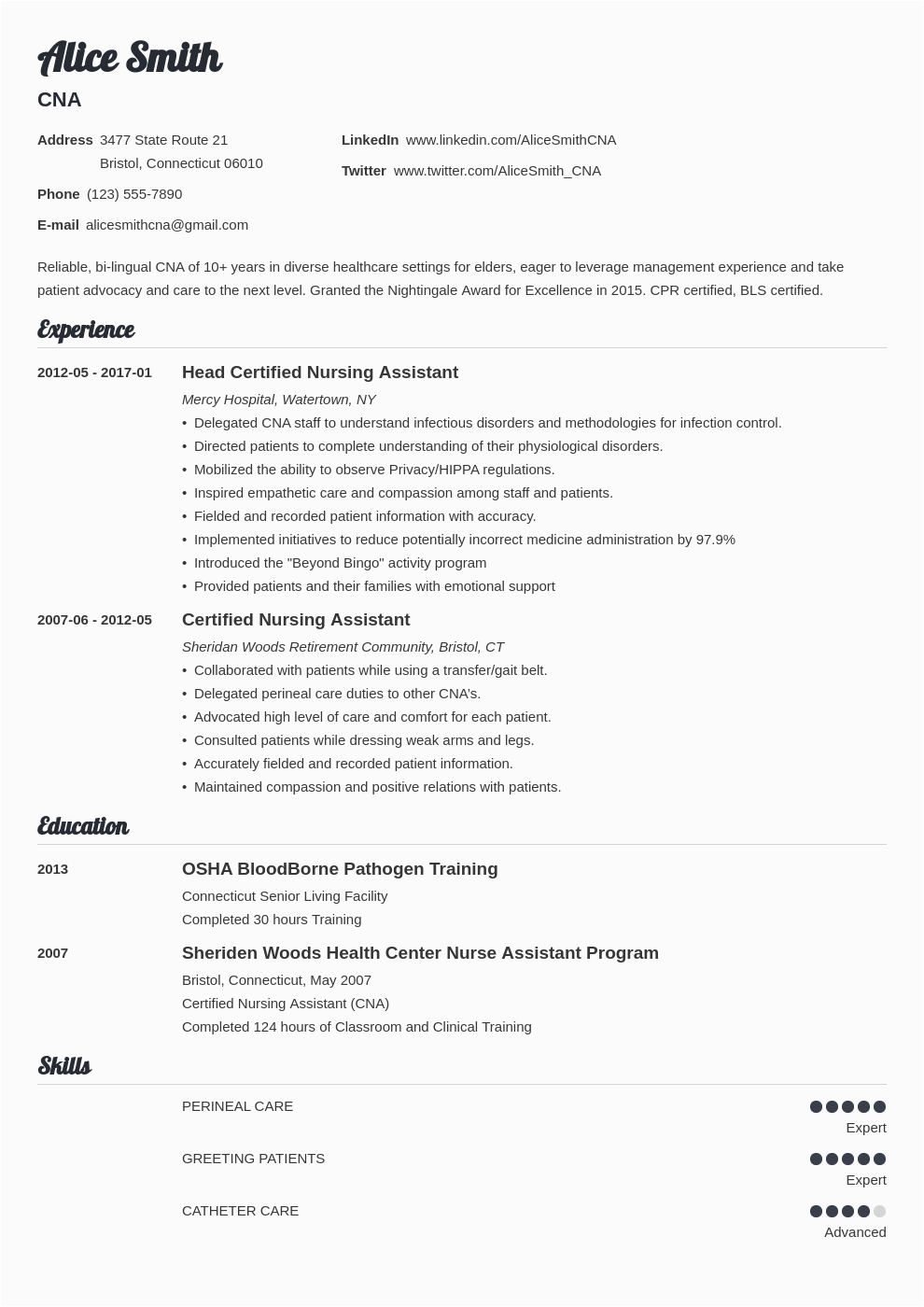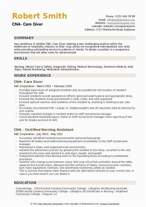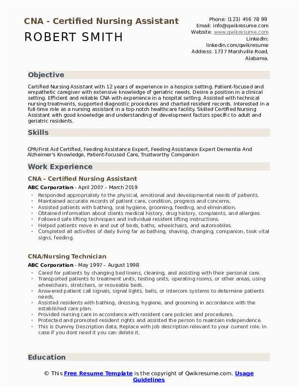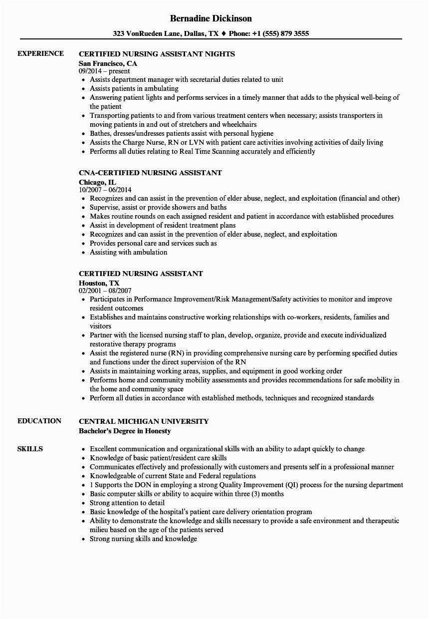 in the manner of you are searching for the absolute job, you will of course desire to put your best foot deal with subsequently an impressive and well-formatted resume. One way of assuring that you have such a resume is to download a cna certified nursing assistant resume sample. These templates can pay for you gone the correct resume you are looking for or simply use them as a guide to make your own.