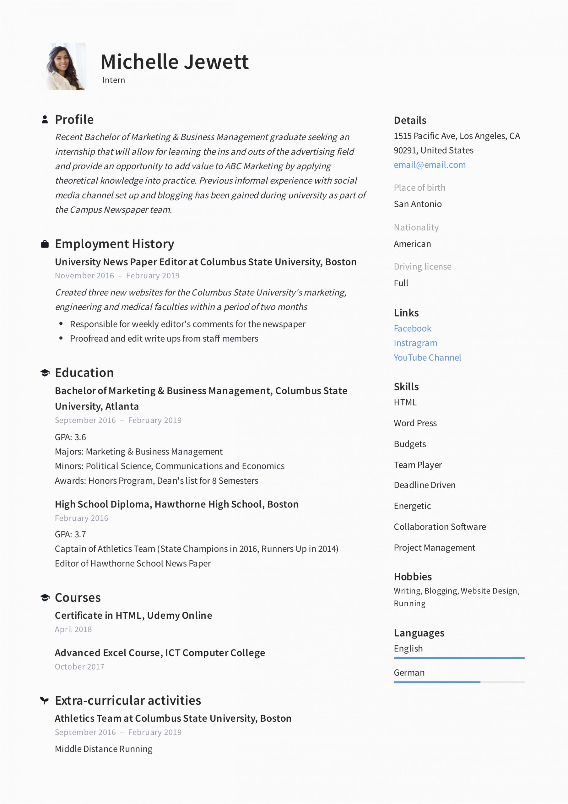 College Student Resume for Internship Template downloads can be a lifesaver gone you see how cooperative they can be. The support of using them are numerous. They save time, manage to pay for fine formatting, presentation, and can support you market yourself professionally. The idea of promotion is creating a lasting impression. Your resume markets you!