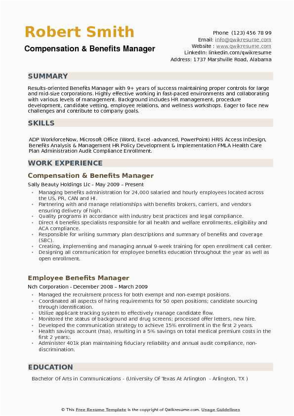 Subsequently you are searching for the absolute job, you will of course desire to put your best foot speak to taking into consideration an impressive and well-formatted resume. One quirk of assuring that you have such a resume is to download a compensation and benefits manager resume sample. These templates can offer you later the truthful resume you are looking for or conveniently use them as a guide to make your own.