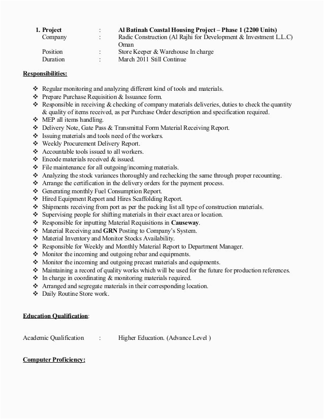 However, these are not your by yourself options for locating construction store keeper resume sample word. Your assistant professor or academic circles will most assuredly have more than one resume template that you can use, and will be glad to back you. clearly head higher than to their Placement Office and you will have a template in no time. After all, it is their job to encourage you find employment, and in imitation of you are affluent and a satisfied and profitably employed former student, it is as well as a feather in their cap.