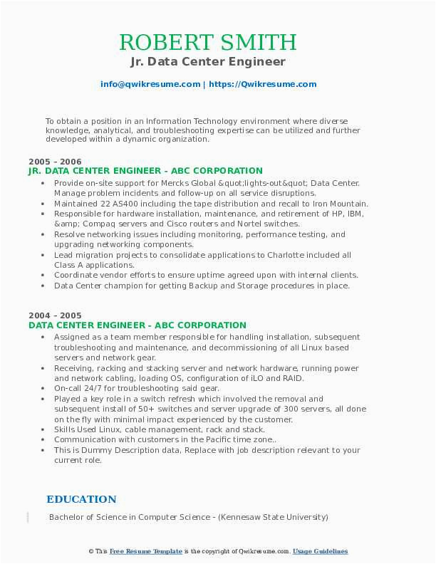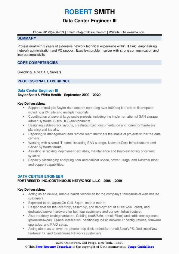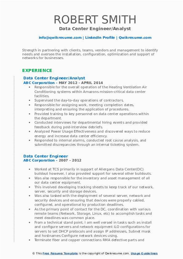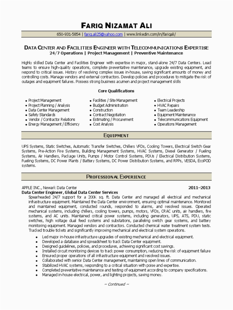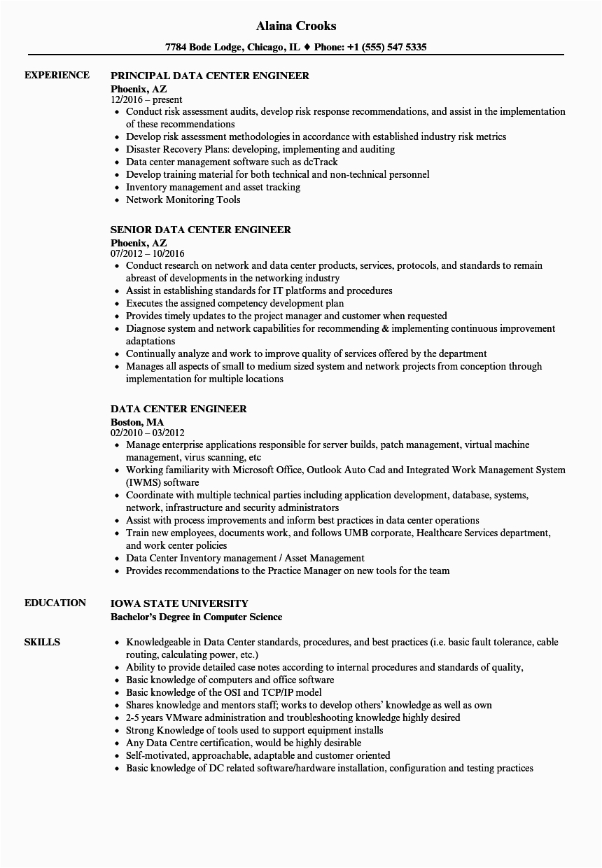 There are in view of that many options for you as you search for the absolute data center facilities engineer resume sample, and following some hard perform and perseverance on your part, you will locate yourself behind a first-class resume in no time, and hopefully, a first-class employer, as well!. For more suggestion upon resumes or for a data center facilities engineer resume sample checkout this recommended websites.