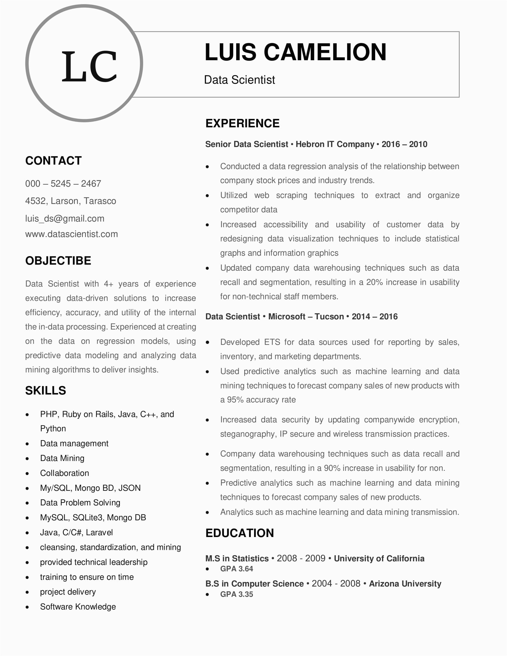 Data Scientist Resume Template Free Download downloads can be a lifesaver like you see how accepting they can be. The support of using them are numerous. They keep time, pay for good formatting, presentation, and can back you make public yourself professionally. The idea of marketing is creating a lasting impression. Your resume markets you!