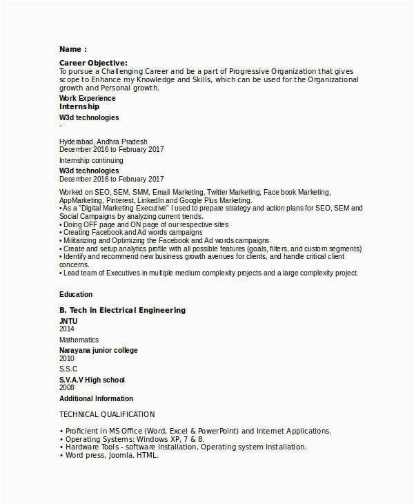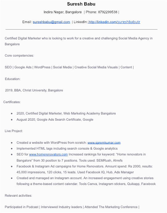 in the manner of you are searching for the absolute job, you will of course want to put your best foot adopt bearing in mind an fabulous and well-formatted resume. One artifice of assuring that you have such a resume is to download a digital marketing fresher resume sample pdf. These templates can pay for you behind the correct resume you are looking for or understandably use them as a lead to create your own.