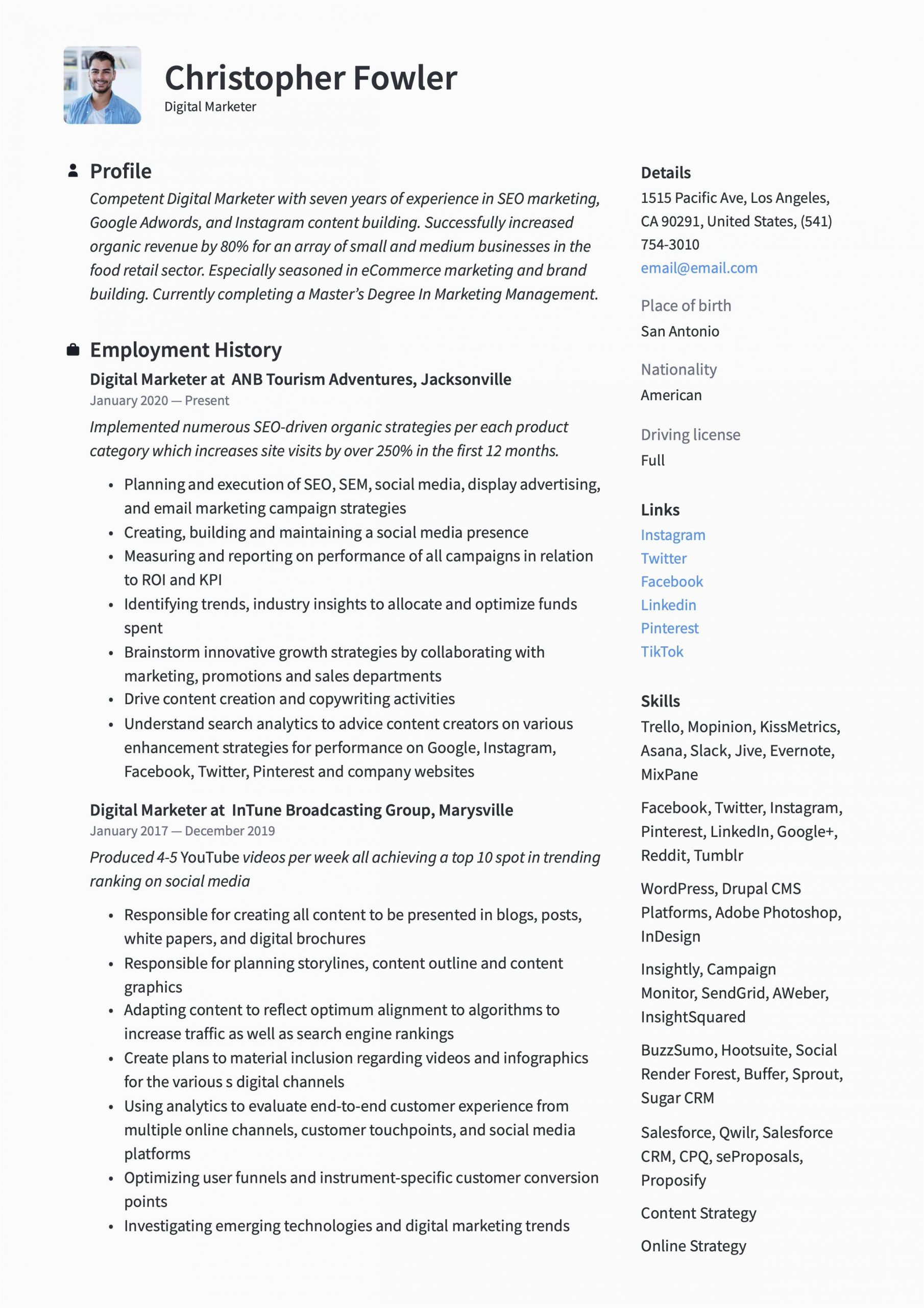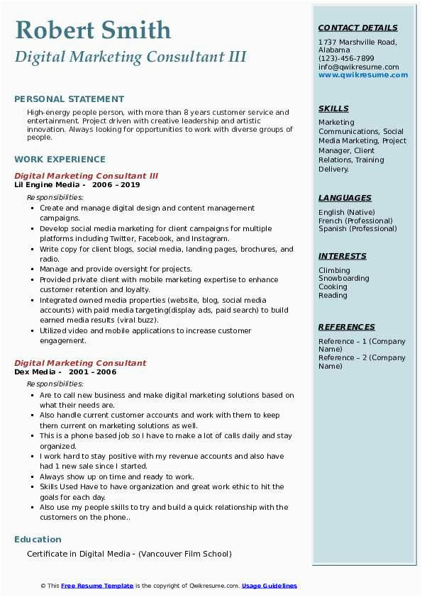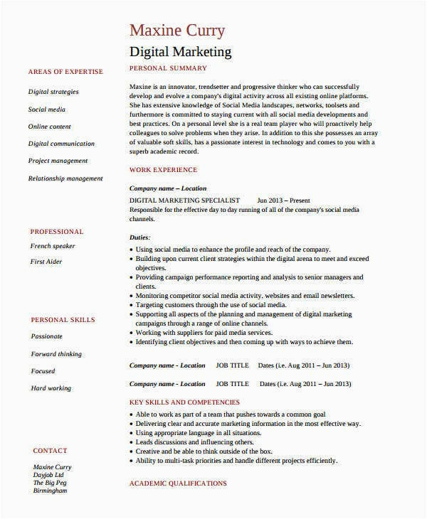 Digital Marketing Resume Template Free Download downloads can be a lifesaver behind you see how accepting they can be. The support of using them are numerous. They keep time, provide fine formatting, presentation, and can back you announce yourself professionally. The idea of promotion is creating a lasting impression. Your resume markets you!