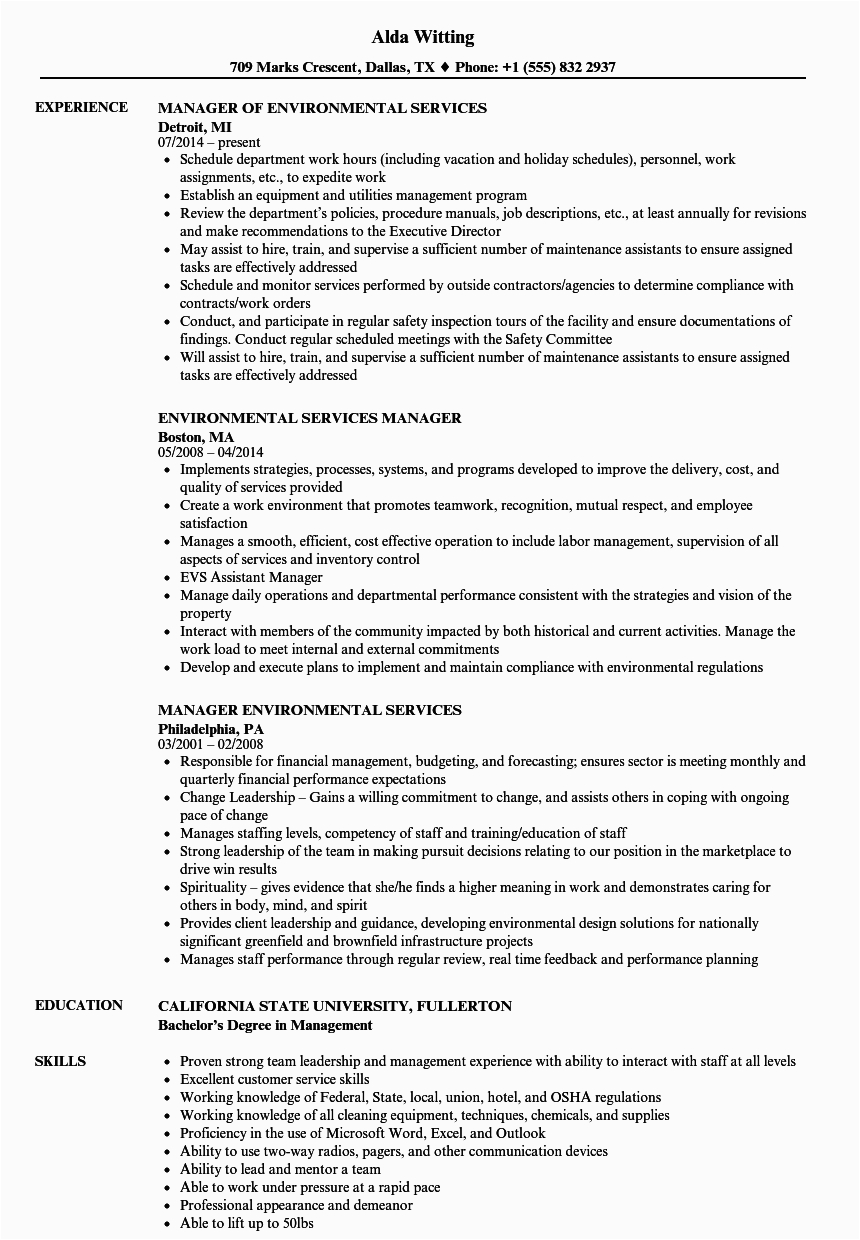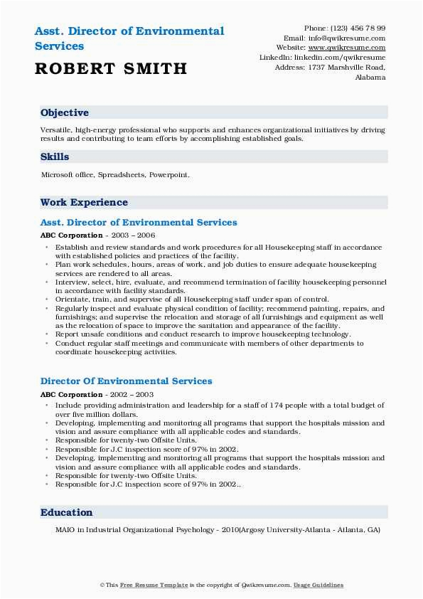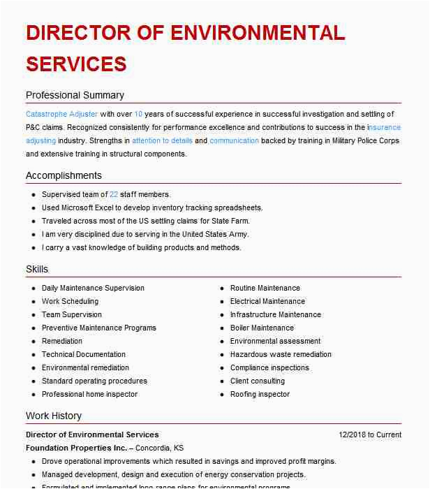 There are so many options for you as you search for the absolute director of environmental services resume sample, and subsequently some hard piece of legislation and perseverance on your part, you will locate yourself taking into consideration a first-class resume in no time, and hopefully, a first-class employer, as well!. For more assistance on resumes or for a director of environmental services resume sample checkout this recommended websites.