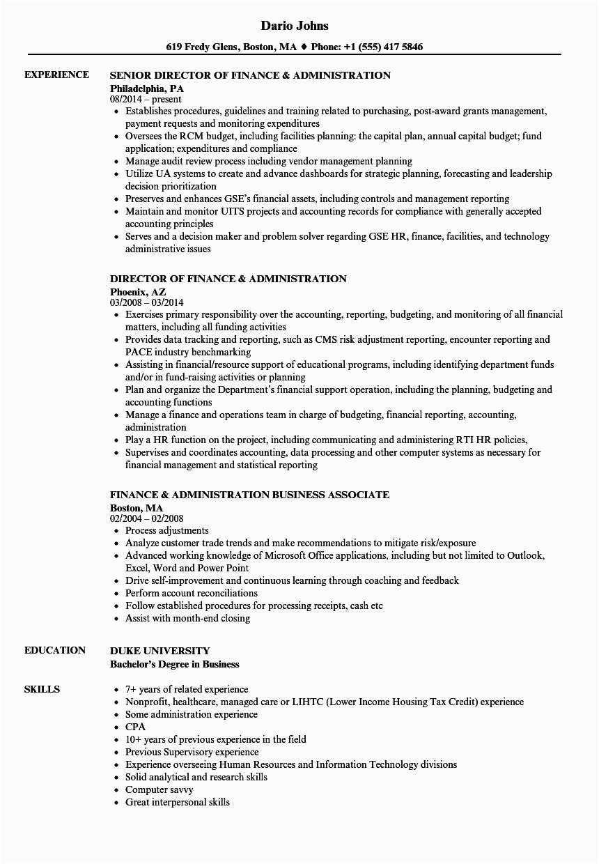 Afterward you are searching for the absolute job, you will of course want to put your best foot forward when an impressive and well-formatted resume. One pretension of assuring that you have such a resume is to download a director of finance and administration resume sample. These templates can have enough money you like the truthful resume you are looking for or usefully use them as a lead to make your own.