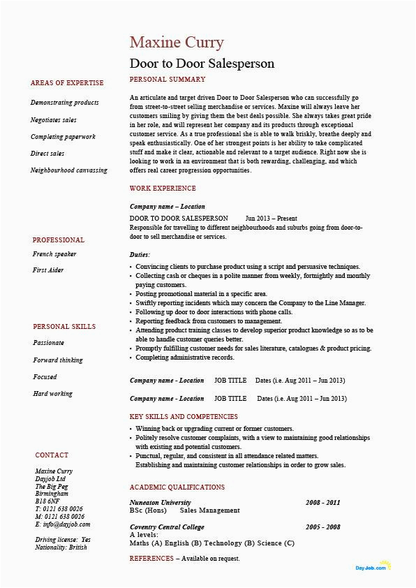 And for every website you come across that has a door to door sales resume sample, you will find that there are specialized templates for just practically any type of resume you hope to create. You can locate a door to door sales resume sample for an entry-level position, and you can find a template for just just about any type of job or career you are looking for.