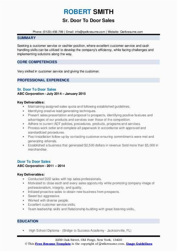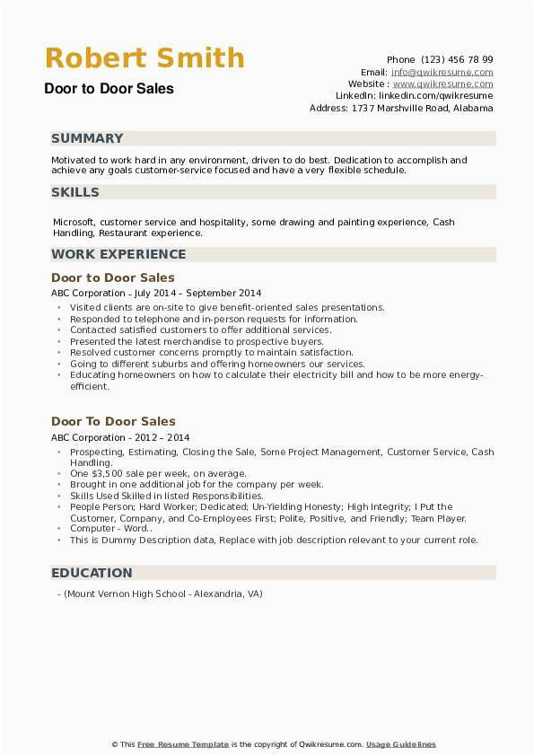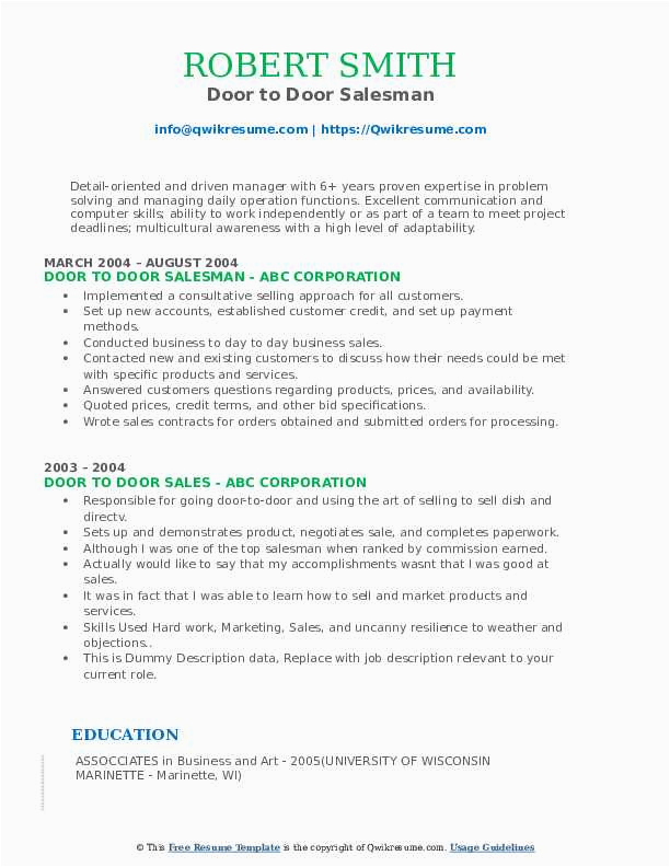 There are hence many options for you as you search for the absolute door to door sales resume sample, and gone some difficult do something and perseverance upon your part, you will find yourself following a first-class resume in no time, and hopefully, a first-class employer, as well!. For more guidance on resumes or for a door to door sales resume sample checkout this recommended websites.