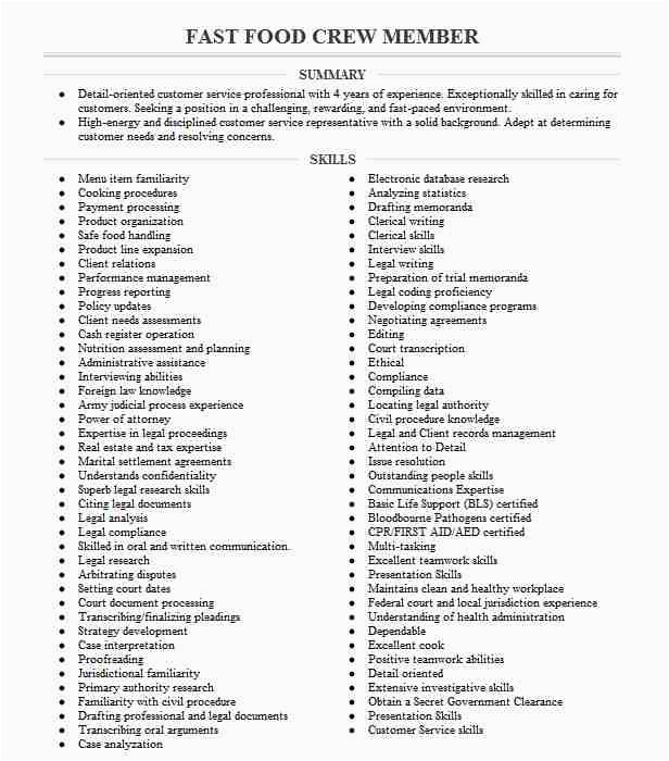 However, these are not your by yourself options for locating Fast Food Crew Member Resume Sample. Your university or university circles will most assuredly have more than one resume template that you can use, and will be happy to assist you. handily head exceeding to their Placement Office and you will have a template in no time. After all, it is their job to incite you find employment, and once you are flourishing and a satisfied and usefully employed former student, it is after that a feather in their cap.