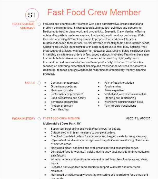 And for all website you come across that has a Fast Food Crew Member Resume Sample, you will find that there are specialized templates for just about any type of resume you wish to create. You can locate a Fast Food Crew Member Resume Sample for an entry-level position, and you can locate a template for just not quite any type of job or career you are looking for.