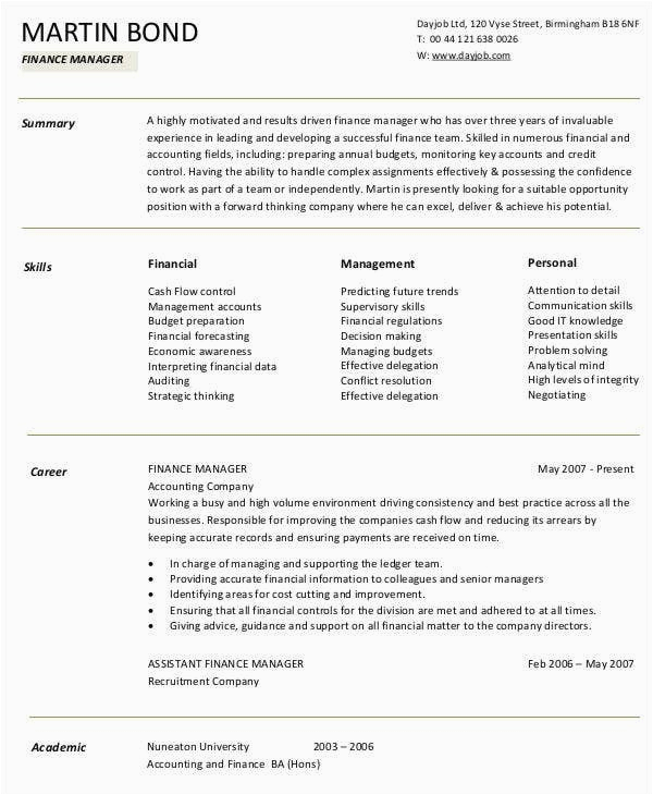 However, these are not your only options for locating free sample resume for finance manager. Your speculative or academic circles will most assuredly have more than one resume template that you can use, and will be happy to encourage you. handily head exceeding to their Placement Office and you will have a template in no time. After all, it is their job to back you find employment, and following you are well-off and a satisfied and valuably employed former student, it is after that a feather in their cap.