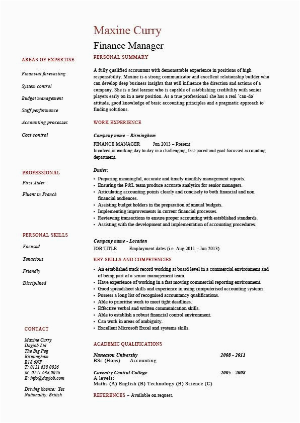 Do you have a pal or relative who has a job you be crazy about and a fine grasp of how to format and create a resume? Why not ask them to see the resume that they used, and use that for your free sample resume for finance manager?