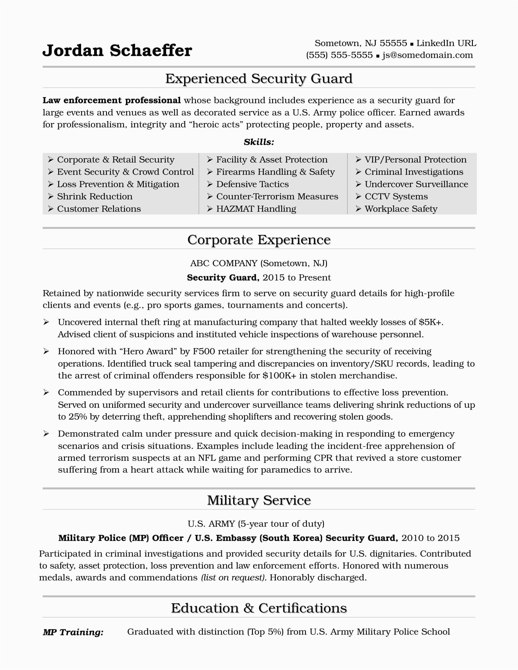 Next you are searching for the perfect job, you will of course want to put your best foot direct as soon as an fabulous and well-formatted resume. One way of assuring that you have such a resume is to download a free sample resume for security guard. These templates can manage to pay for you later than the precise resume you are looking for or clearly use them as a lead to create your own.