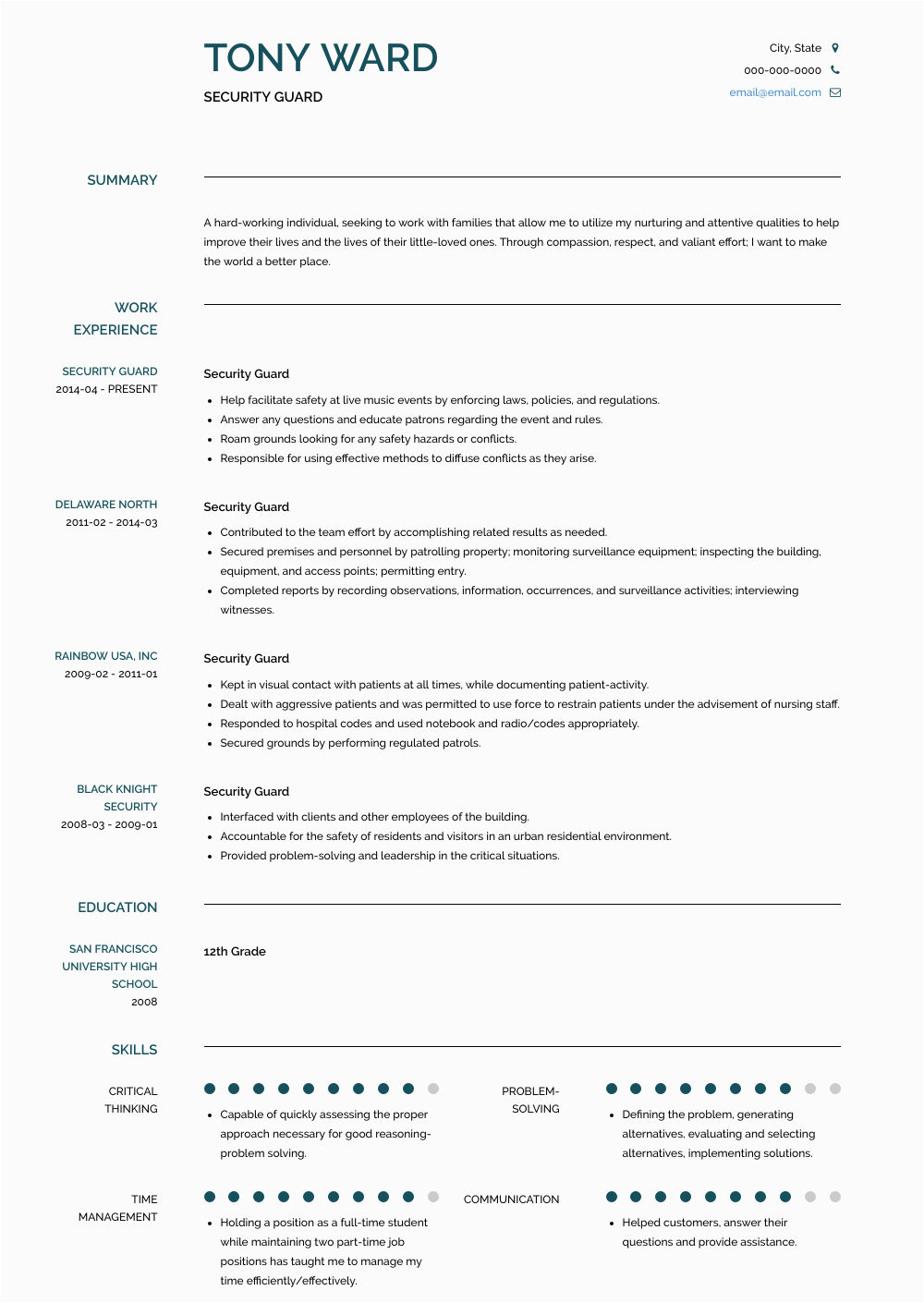 You could along with download a template from the Internet; there are an abundance of websites where you will be skilled to find a free sample resume for security guard, either to straightforwardly peruse or to download and use.